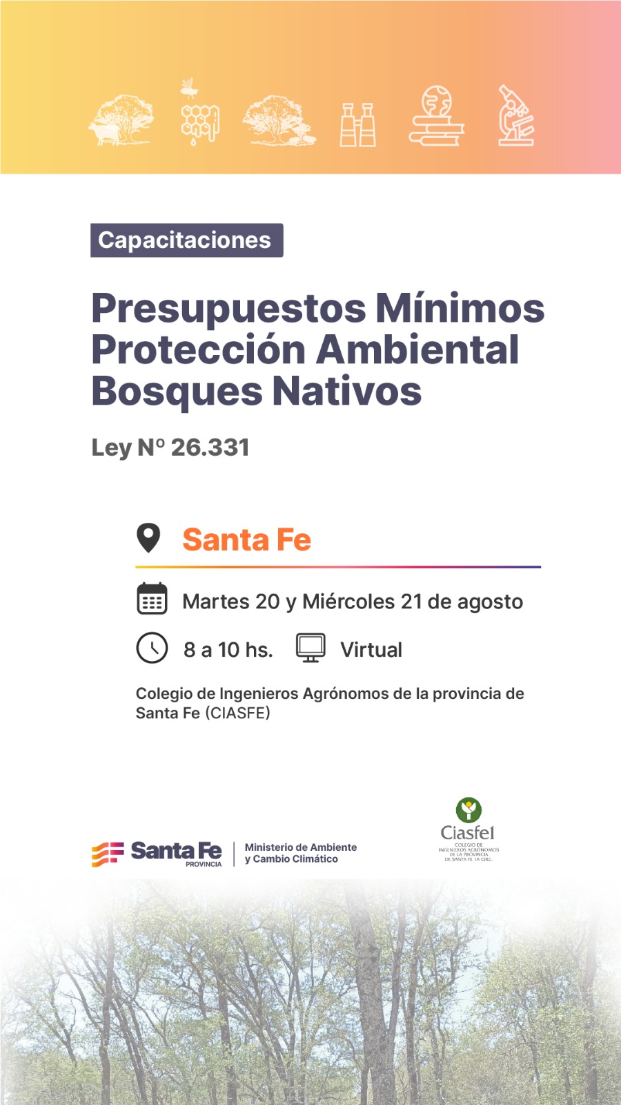 En la misma se abordar谩n aspectos te贸ricos y normativos respecto a la Ley de Presupuestos M铆nimos de Protecci贸n Ambiental de Bosques Nativos - N掳 26.331 -, consideraciones a la hora de realizar las actividades en superficies boscosas, autorizaciones de actividades, beneficios, entre otros.
